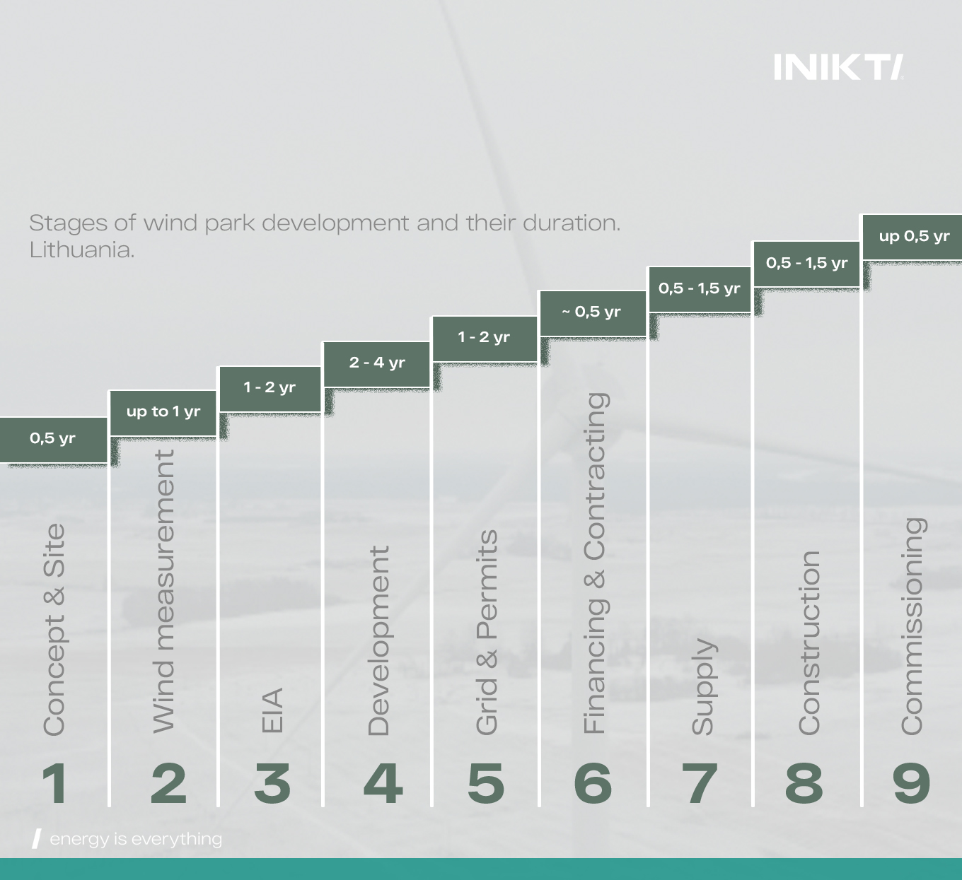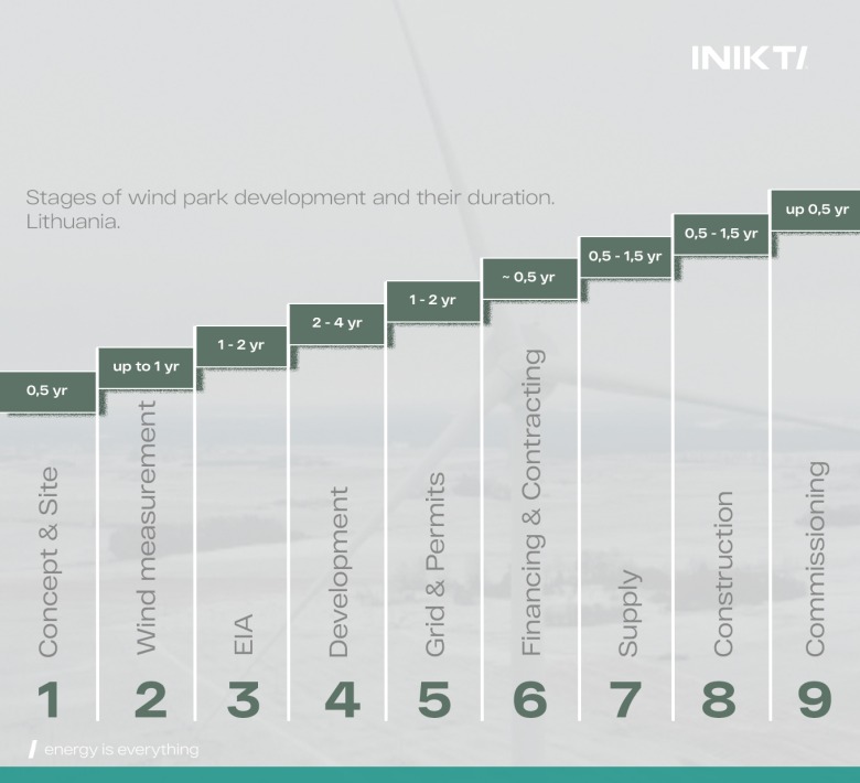 Developing a wind park in Lithuania usually takes 5–10 years and involves multiple stages:1. Concept & Site – wind potential is analyzed, land plots and grid connection possibilities are assessed.