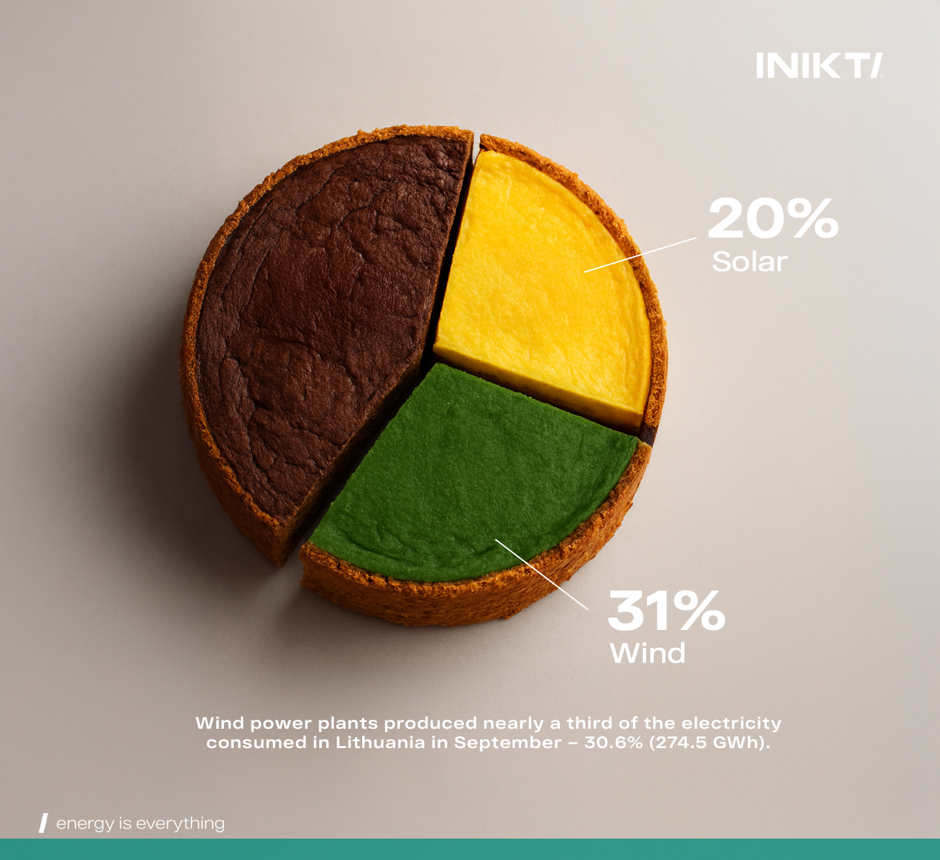 Wind power produced 30.6 % (274.5 GWh) of Lithuania’s electricity consumption in September – nearly a third of the country’s total demand. Solar power contributed 17.9 % (160.5 GWh), while the need for imports decreased to 26.8%, compared with 36.5 % the previous year.